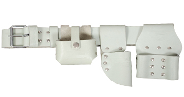 White leather scaffolding tool belts. Hand made in the Pakistan from premium 4mm-thick black leather. The range includes: scaffold tool belt sets,